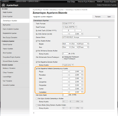 Haftanın her günü için belirtilen bir zamanda gücün otomatik olarak kapanmasını sağlayacak bir ayar yapabilirsiniz. Bu, gücü kapatma işleminin ihmal edilmesinden dolayı meydana gelebilecek gereksiz enerji tüketimini önleme olanağı tanır. Varsayılan olarak, bu işlev devre dışı bırakılmıştır.
