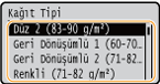 Yüklenen kağıdı sıklıkla değiştirmeniz gerekiyorsa, <Serbest> olarak ayarlamak ayarın değiştirilmesi için her seferinde gereken adım sayısını azaltır. Ancak, yazıcı sürücüsündeki kağıt türü ayarı ile makineye gerçekte yüklenen kağıt türü aynı olmasa bile, bu ayar seçiliyken makinenin yazdırmaya devam edeceğini unutmayın.