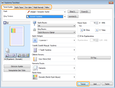 Yazdırma ayarları gerektiği gibi belirtin ve [Tamam] öğesini tıklatın.
