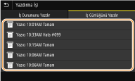 Günlüğünü kontrol etmek istediğiniz belgeyi seçin.<Tamam>, bir belge başarıyla yazdırıldığında görüntülenir ve <Hata>, bir belge iptal edildiği veya hata oluştuğu için belge yazdırılamadığında görüntülenir.