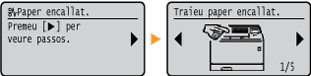 En alguns casos, quan es produeix un error, apareixen instruccions sobre com respondre a l'error. Seguiu les instruccions de la pantalla per solucionar el problema. A continuació s'ofereix com a exemple la pantalla que es mostra quan es produeix un encallament de paper.