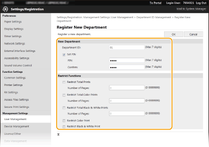 [Restrict Functions] Можна обмежити кількість сторінок для друку та доступні функції для відділів, які потрібно зареєструвати. Щоб обмежити кількість сторінок для друку, установіть прапорець поряд із цільовим типом і введіть відповідну кількість сторінок у полі [Number of Pages]. Установіть прапорець поряд із цільовими функціями для обмеження функцій.