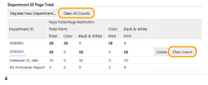 Щоб скинути лічильники, у стовпці [Department ID] виберіть відповідне текстове посилання та натисніть кнопку [Clear Count] /b_key_arrow_right.gif) [OK]. Якщо потрібно скинути лічильники всіх ідентифікаторів відділів на нуль, виберіть елементи [Clear All Counts] /b_key_arrow_right.gif) [OK].