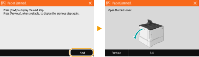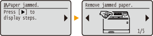 У деяких випадках у разі виникнення помилок на екрані відображаються інструкції з їх усунення. Для вирішення проблеми дотримуйтесь інструкцій, що з’являться на екрані. Нижче для прикладу наведено зображення екрана, який відображається, коли сталося зминання паперу.