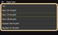 Якщо наведений вище екран не відображається після завантаження паперуЯкщо в багатоцільовий лоток потрібно постійно завантажувати папір одного формату, можна пропустити операції з налаштування параметрів паперу, зареєструвавши формат і тип паперу як параметр за промовчанням. Коли зареєстровано параметри за промовчанням, наведений вище екран не відображається. Щоб відображати екран, виберіть <Specify When Loading Paper> (Реєстрація параметрів паперу за промовчанням для багатоцільового лотка).