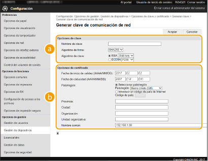 Cuando [SHA384] o [SHA512] están seleccionados en [Algoritmo de firma], [512 bits] no podrá seleccionarse como longitud de clave si está seleccionado [RSA] en [Algoritmo de clave].