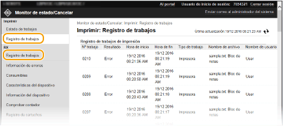 Cuando se produzca un error, esta página aparecerá haciendo clic en el mensaje que aparece debajo de [Información de errores] en la página del Portal (página principal).