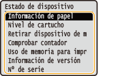 Muestra el estado del equipo, como puede ser la cantidad de papel o la cantidad de tóner restante en los cartuchos de tóner.