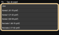 Si usted necesita cambiar con frecuencia el papel que está cargado, configúrelo en <Libre>; de esta manera se reducirá el número de pasos que hay que realizar para cambiar la opción. No obstante, tenga en cuenta que esta opción permite que el equipo imprima incluso aunque no coincida la opción de tipo de papel del controlador de impresora y el tipo de papel que está cargado en el equipo.