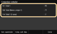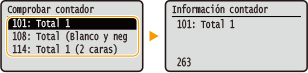 Puede consultar por separado los totales del número de páginas utilizadas para las impresiones en color y las impresiones en blanco y negro. El número de impresiones incluye las impresiones desde dispositivos de memoria y también las impresiones de datos desde ordenadores.