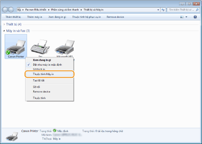 Nhấp chuột phải vào biểu tượng trình điều khiển máy in cho máy này, và nhấp chuột vào [Printer properties] (Đặc tính của máy in) hoặc [Properties] (Đặc tính).