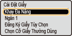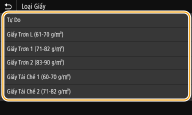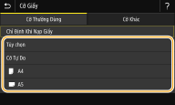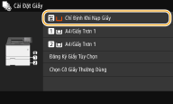 Sau khi cài đặt giấy mặc định được đăng ký, màn hình cài đặt giấy sẽ không hiển thị khi giấy được nạp, và máy luôn sử dụng cài đặt cùng loại. Nếu bạn nạp một cỡ và loại giấy khác mà không thay đổi cài đặt giấy, máy có thể sẽ không in đúng. Để tránh vấn đề này, chọn <Chỉ Định Khi Nạp Giấy> trong bước 3, và sau đó nạp giấy.