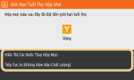 Nếu thông báo này được hiển thị cho hộp mực màu đen trong khi đang nhận tài liệu I-Fax, máy không thực hiện việc in ấn để tránh in ra bản in không rõ ràng. Để tiếp tục in ngay cả khi lượng mực còn lại trong hộp mực mực thấp, cài đặt <Tiếp Tục In Khi Hộp Mực Còn It> thành <Bật>. <Tiếp Tục In Khi Hộp Mực Còn It>