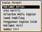 Memaparkan status mesin, seperti jumlah kertas atau jumlah baki toner dalam kartrij toner.