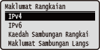 Memaparkan tetapan rangkaian seperti alamat IP mesin dan status seperti keadaan komunikasi LAN wayarles.