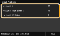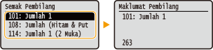 Anda boleh menyemak jumlah berasingan bagi jumlah halaman yang digunakan untuk cetakan warna dan cetakan hitam dan putih. Jumlah cetakan ini termasuk cetakan daripada cetakan media memori dan juga senarai cetakan data daripada komputer.