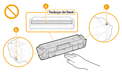 Apabila mengeluarkan kartrij toner daripada mesin ini untuk penyimpanan, letakkan kartrij toner yang dikeluarkan tersebut ke dalam bahan pembungkusan asal atau balut dengan kain yang tebal.