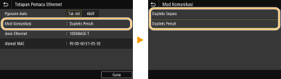 Hantar dan terima data komunikasi secara berselang-seli. Pilih apabila mesin disambungkan dengan peranti rangkaian menggunakan dupleks separuh. <Dupleks Penuh>
