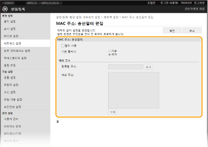 MAC 주소를 잘못 입력하면 리모트 UI에서 기기에 액세스하지 못할 수도 있으며 이러한 경우 <MAC 주소 필터>를 <해제>로 설정해야 합니다. <MAC 주소 필터>
