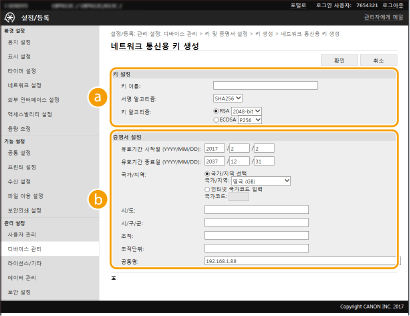 TLS(Transport Layer Security )를 통한 암호화된 통신에 필요한 경우 기기에서 키 및 인증서를 생성할 수 있습니다. 리모트 UI를 통해 기기에 액세스할 때 TLS를 사용할 수 있습니다. 자체 서명된 인증서가 "네트워크 통신용"에서 생성된 키 및 인증서와 함께 사용됩니다.