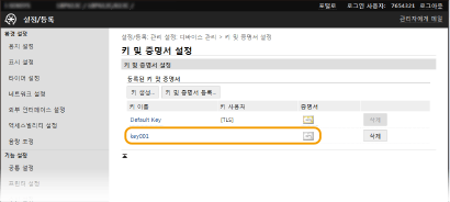 [[TLS]] 아래 "[IEEE 802.1X]" 또는 "키 사용처"가 표시되는 경우와 같이, 키 및 인증서가 현재 특정 목적에 사용되는 경우에는 키 및 인증서를 삭제할 수 없습니다. 이런 경우, 기능을 비활성화 하거나 삭제 전에 키 및 인증서를 교체하십시오.