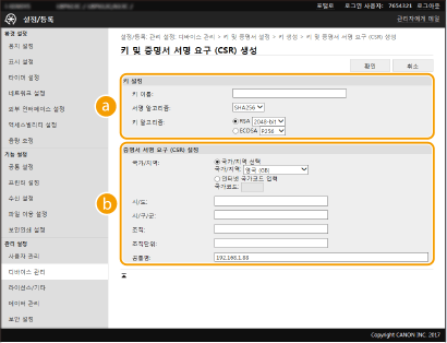 기기에서 생성된 인증서에는 CA 서명이 없으므로, 통신 대상 장치에 따라 통신 오류가 발생할 수 있습니다. CA 서명이 있는 인증서를 인증 기관으로부터 발급 받으려면 관리자가 리모트 UI에서 생선할 수 있는 CSR(인증서 서명 요구) 데이터가 필요합니다. 인증서가 발급되면 생성된 CSR과 함께 키에 등록합니다.