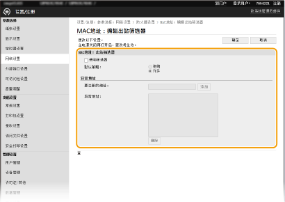 如果错误输入 MAC 地址,则可能无法从远程用户界面访问本机,此时需要将 <MAC地址筛选器> 设置为 <关闭>。 <MAC地址筛选器>