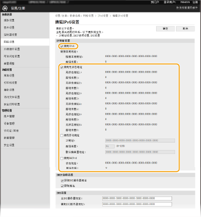 本机的 IPv6 地址可通过远程用户界面配置。设置 IPv6 地址之前,请检查 IPv4 地址设置(查看 IPv4 设置)。您需要设置正确的 IPv4 设置才能使用 IPv6 地址。本机可使用以下多个 IPv6 地址: