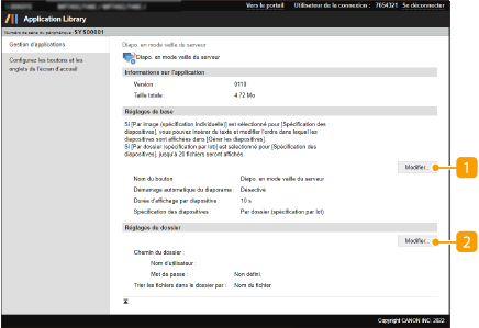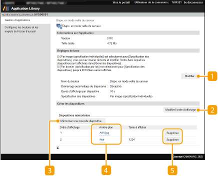 Ouvre la page [Modifier réglages de base]. Dans cette page, vous pouvez changer le nom du bouton, faire un réglage pour que l'affichage de l'écran Accueil soit remplacé par l'affichage d'un cliché et définir le temps d'affichage de chaque cliché.