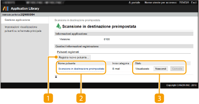 Consente di aprire la pagina [Registra nuovo pulsante]. In questa pagina, è possibile impostare la destinazione, il formato scansione e il nome pulsante da visualizzare sulla schermata principale.