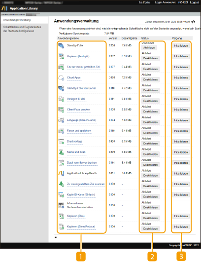 Auf der Seite [Anwendungsverwaltung] können Sie die jeweiligen Anwendungen aktivieren oder deaktivieren und die Einstellungen der jeweiligen Anwendungen ändern.