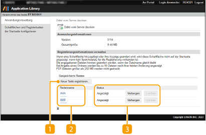 Zeigt eine Liste der registrierten Schaltflächen an. Bei Klicken auf den Link eines Schaltflächennamens in der Liste [Tastenname] wird die Seite [Tastendetails] geöffnet, auf der Sie die Einstellungen für die zugehörige Schaltfläche ändern oder duplizieren können.