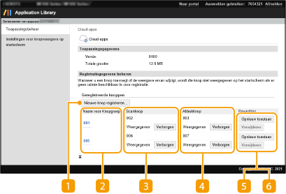 Opent de pagina [Nieuwe knop registreren]. Met behulp van deze pagina kiest u de instellingen voor de verbonden cloudservice en geeft u items op zoals de namen van de knoppen die op het startscherm verschijnen.