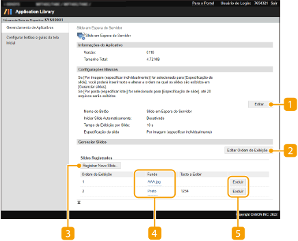 Abre a página [Editar Configurações Básicas]. Nesta página, você pode alterar o nome do botão, fazer um ajuste de modo que a tela inicial mude automaticamente para uma exibição de slides, e definir o tempo de exibição de cada slide.