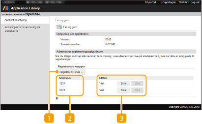 Viser en liste over de registrerede knapper. Hvis du klikker på linket for et knapnavn på [Knapnavn]-listen, åbnes [Knapoplysninger]-siden, så du kan ændre eller duplikere indstillingerne for den pågældende knap.