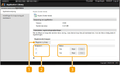 Viser en liste over de registrerede knapper. Hvis du klikker på linket for et knapnavn på [Knapnavn]-listen, åbnes [Knapoplysninger]-siden, så du kan ændre eller duplikere indstillingerne for den pågældende knap.
