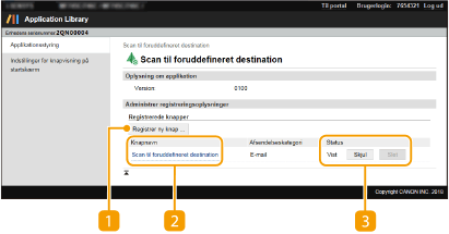 Viser en liste over de registrerede knapper. Hvis du klikker på linket for et knapnavn på [Knapnavn]-listen, åbnes [Knapoplysninger]-siden, så du kan ændre eller duplikere indstillingerne for den pågældende knap.