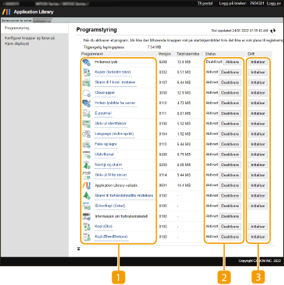 Viser en liste over applikasjoner som er installert på maskinen. Når du klikker på linken til en applikasjon i listen [Programnavn], vises innstillingsiden for den applikasjonen.