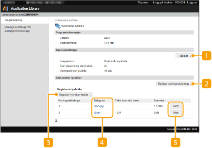 Åpner siden [Rediger basisinnstillinger]. På denne siden kan du endre navnet på knappen, utføre en innstilling slik at Hjem-skjermen automatisk bytter til en lysbildevisning, og stiller inn visningstiden for hvert lysbilde.