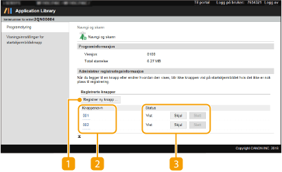 Viser en liste over registrerte knapper. Når du klikker på linken for en knapp i listen [Knappenavn], åpnes siden [Knappedetaljer], som lar deg endre eller duplisere innstillingene for den tilhørende knappen.