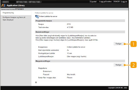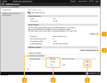 Åpner siden [Rediger basisinnstillinger]. På denne siden kan du endre navnet på knappen, utføre en innstilling slik at Hjem-skjermen automatisk bytter til en lysbildevisning, og stiller inn visningstiden for hvert lysbilde.
