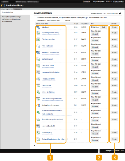 Näyttää laitteeseen asennettujen sovellusten luettelon. Kun sovelluksen linkkiä napsautetaan [Sovelluksen nimi]-luettelossa, sovelluksen asetussivu tulee esiin.