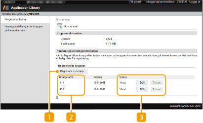 Visar en lista med registrerade knappar. Klicka på länken med knappens namn i listan [Knappnamn] för att öppna sidan [Knappdetaljer] där du kan ändra eller kopiera inställningarna för knappen.