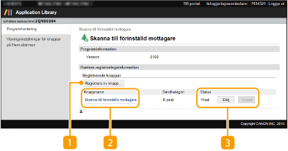 Öppnar sidan [Registrera ny knapp]. På den här sidan kan du ange mottagare, skanningsformat och namnet på knappen som visas på Hem-skärmen.