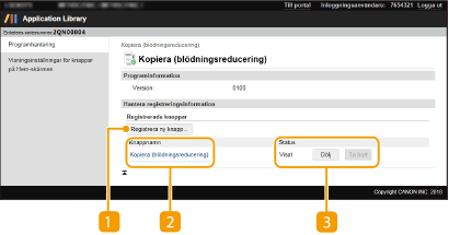 Öppnar sidan [Registrera ny knapp]. På den här sidan kan du ange inställningarna Justera bakgrundstäthet och Radera kant samt ange namnet på knappen som ska visas på Hem-skärmen.