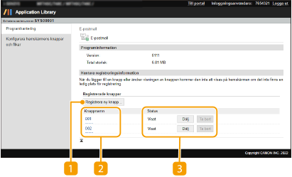 Visar en lista med registrerade knappar. Klicka på länken med knappens namn i listan [Knappnamn] för att öppna sidan [Knappdetaljer] där du kan ändra eller kopiera inställningarna för knappen.