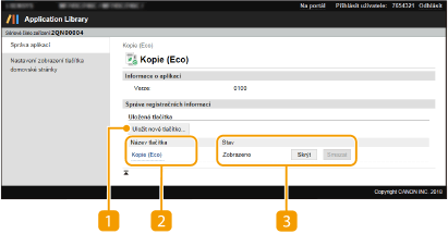 Otevře stránku [Uložit nové tlačítko]. Na této stránce můžete pro dané tlačítko nastavit poměr kopírování, nastavení tisku N na 1 a název tlačítka, který se bude zobrazovat na domovské obrazovce.