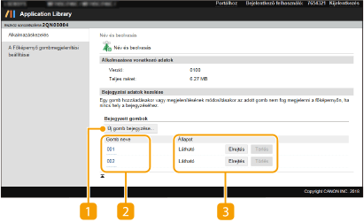 Megjeleníti a bejegyzett gombok listáját. A [Gomb neve] listában szereplő valamely gomb nevére mutató hivatkozásra kattintva megjelenik a [Gombra vonatkozó adatok] oldal, ahol módosíthatja az adott gomb beállításait, vagy másodpéldányt készíthet róluk.