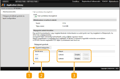 Megjeleníti a bejegyzett gombok listáját. A [Gomb neve] listában szereplő valamely gomb nevére mutató hivatkozásra kattintva megjelenik a [Gombra vonatkozó adatok] oldal, ahol módosíthatja az adott gomb beállításait, vagy másodpéldányt készíthet róluk.