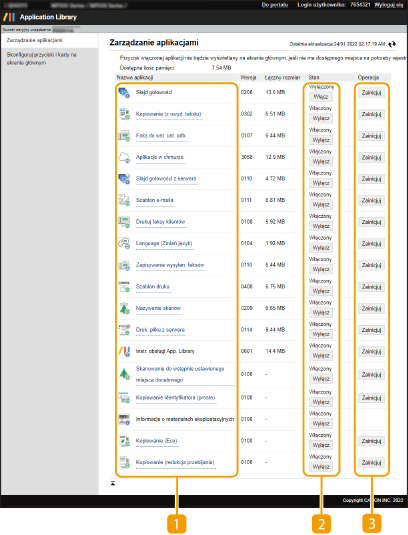 Strona [Zarządzanie aplikacjami] umożliwia włączanie lub wyłączanie każdej aplikacji i zmianę ustawień każdej aplikacji.